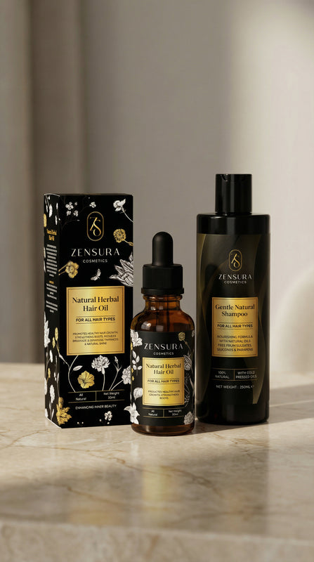 Zensura Haarolie is een 100% natuurlijke, luxueuze olie die speciaal is ontwikkeld om haargroei te stimuleren en je haar te versterken. Onze unieke formule combineert krachtige oliën zoals castorolie, avocado-olie en rozemarijnolie met krachtige kruiden zoals cassiabloem, hennazaad en pygeum. Deze ingrediënten voeden niet alleen je haar, maar houden ook je hoofdhuid gezond.